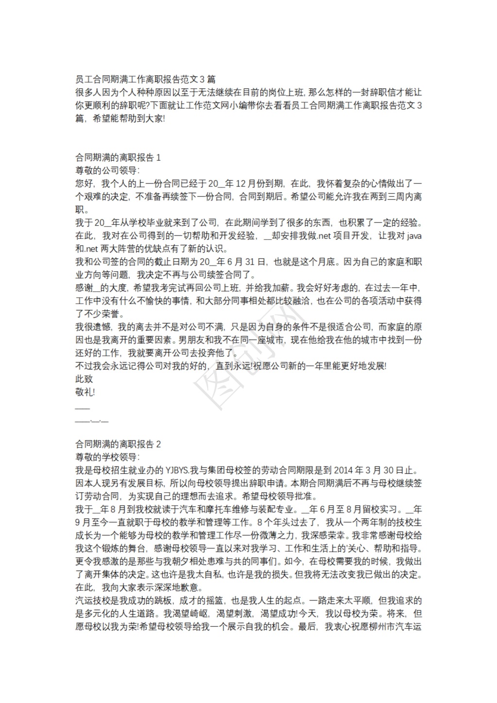 员工合同期满工作离职报告