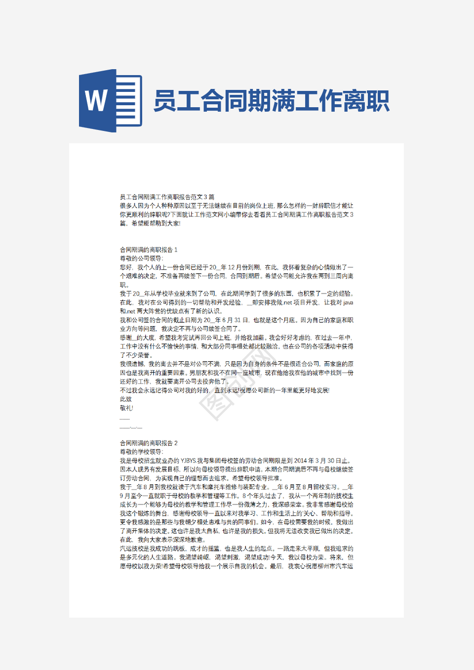 本作品内容为员工合同期满工作离职报告, 请使用软件Word(2019)打开, 作品中文字及图均可以修改和编辑,图片更改请在作品中右键图片并更换,文字修改请直接点击文字进行修改,也可以新增和删除作品中的内容, 欢迎使用闳图网。