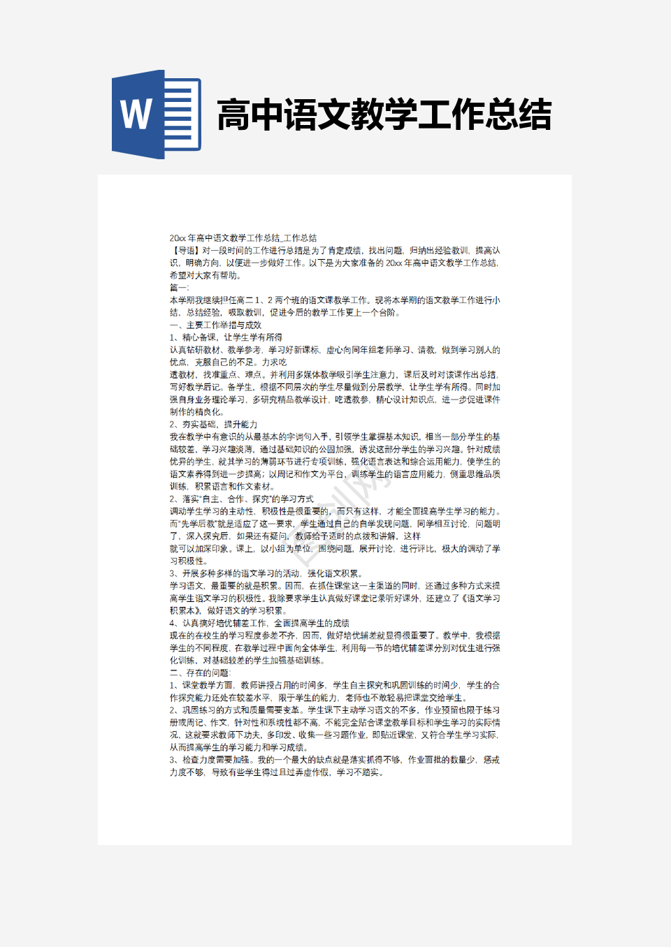 本作品内容为高中语文教学工作总结, 请使用软件Word(2019)打开, 作品中文字及图均可以修改和编辑,图片更改请在作品中右键图片并更换,文字修改请直接点击文字进行修改,也可以新增和删除作品中的内容, 欢迎使用闳图网。
