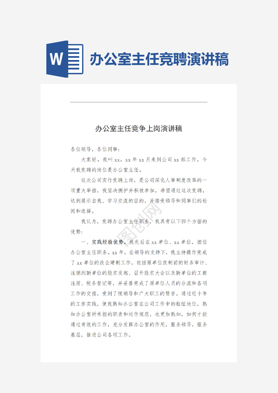 本作品内容为办公室主任竞聘演讲稿, 请使用软件Word(2019)打开, 作品中文字及图均可以修改和编辑,图片更改请在作品中右键图片并更换,文字修改请直接点击文字进行修改,也可以新增和删除作品中的内容, 欢迎使用闳图网。
