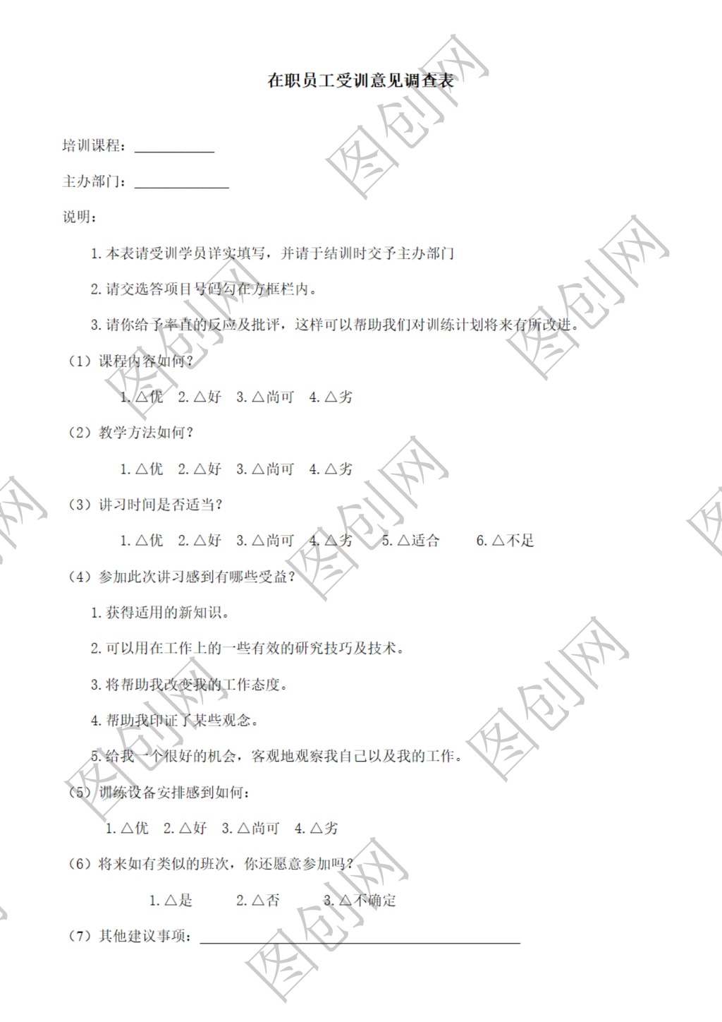 本作品内容为员工培训意见调查表, 请使用软件Word(2019)打开, 作品中文字及图均可以修改和编辑,图片更改请在作品中右键图片并更换,文字修改请直接点击文字进行修改,也可以新增和删除作品中的内容, 欢迎使用闳图网。