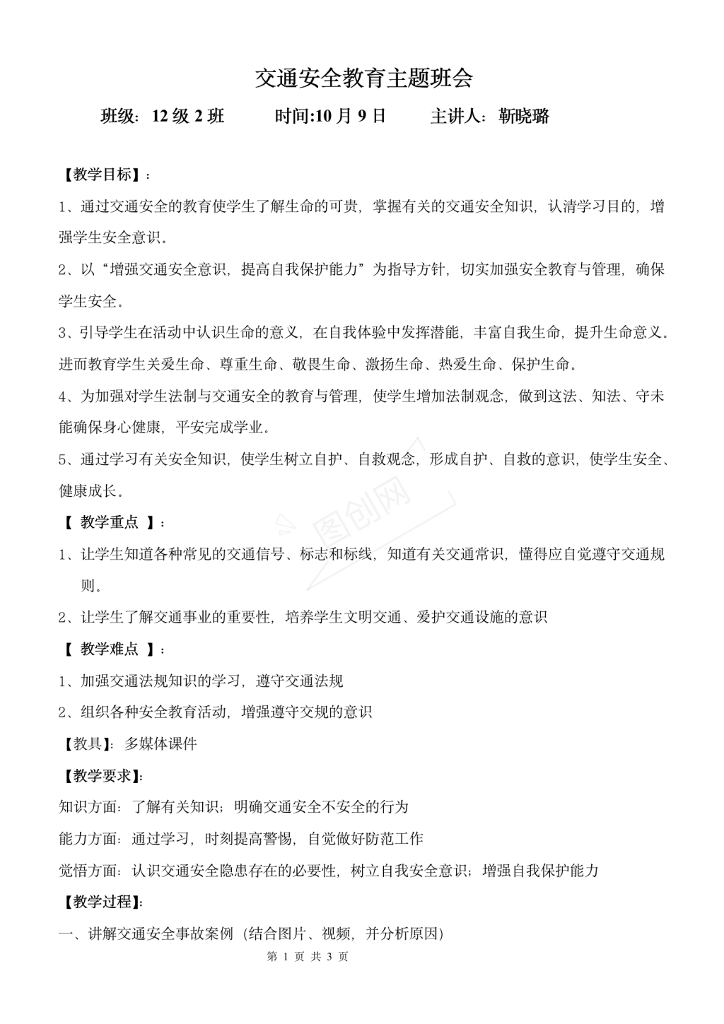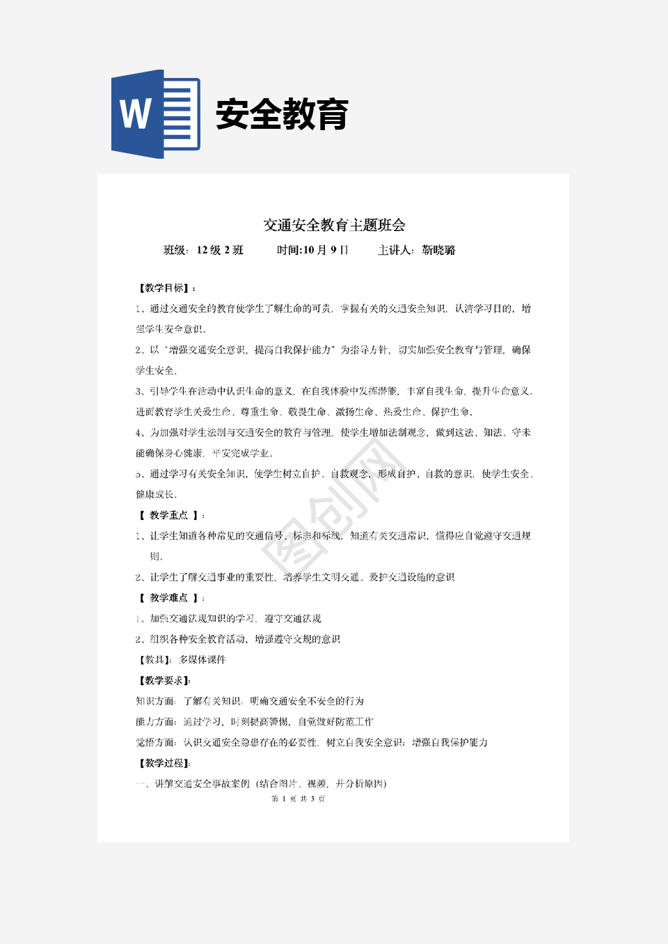 本作品内容为交通安全教育主题班会, 请使用软件Word(2019)打开, 作品中文字及图均可以修改和编辑,图片更改请在作品中右键图片并更换,文字修改请直接点击文字进行修改,也可以新增和删除作品中的内容, 欢迎使用闳图网。