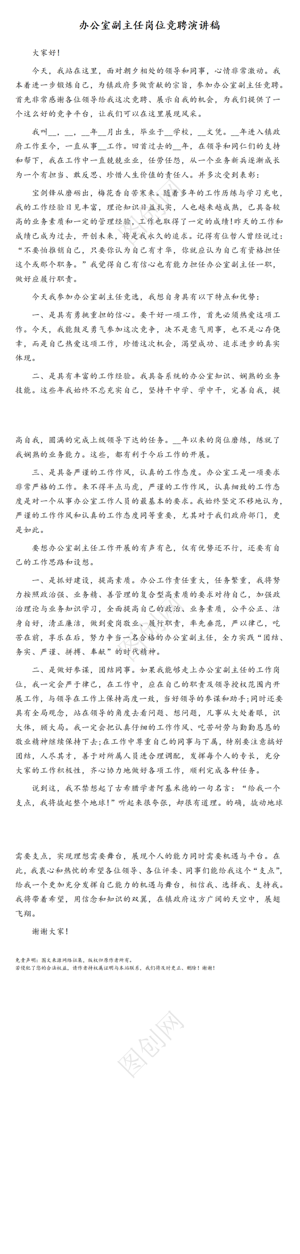 本作品内容为办公室副主任竞聘, 请使用软件Word(2019)打开, 作品中文字及图均可以修改和编辑,图片更改请在作品中右键图片并更换,文字修改请直接点击文字进行修改,也可以新增和删除作品中的内容, 欢迎使用闳图网。