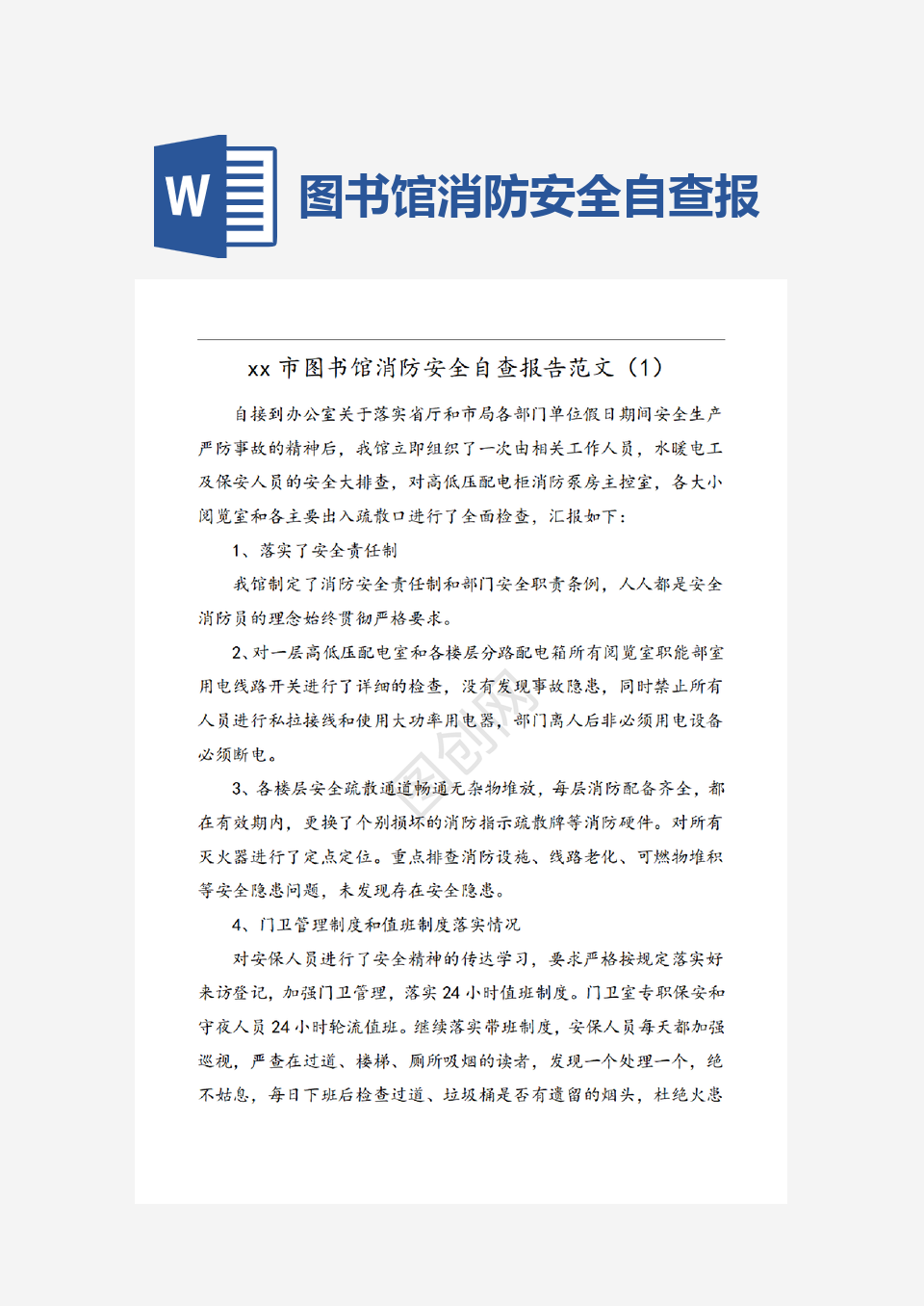 本作品内容为图书馆消防安全自查报告, 请使用软件Word(2019)打开, 作品中文字及图均可以修改和编辑,图片更改请在作品中右键图片并更换,文字修改请直接点击文字进行修改,也可以新增和删除作品中的内容, 欢迎使用闳图网。