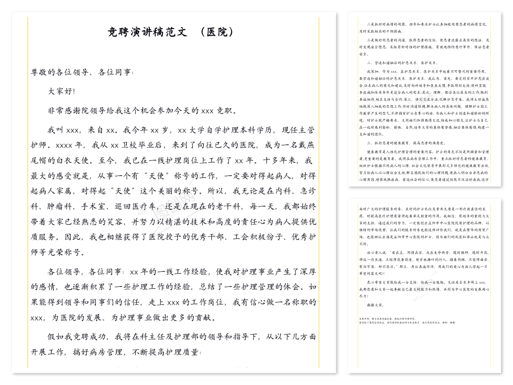 本作品内容为护士竞聘演讲稿, 请使用软件Word(2019)打开, 作品中文字及图均可以修改和编辑,图片更改请在作品中右键图片并更换,文字修改请直接点击文字进行修改,也可以新增和删除作品中的内容, 欢迎使用闳图网。