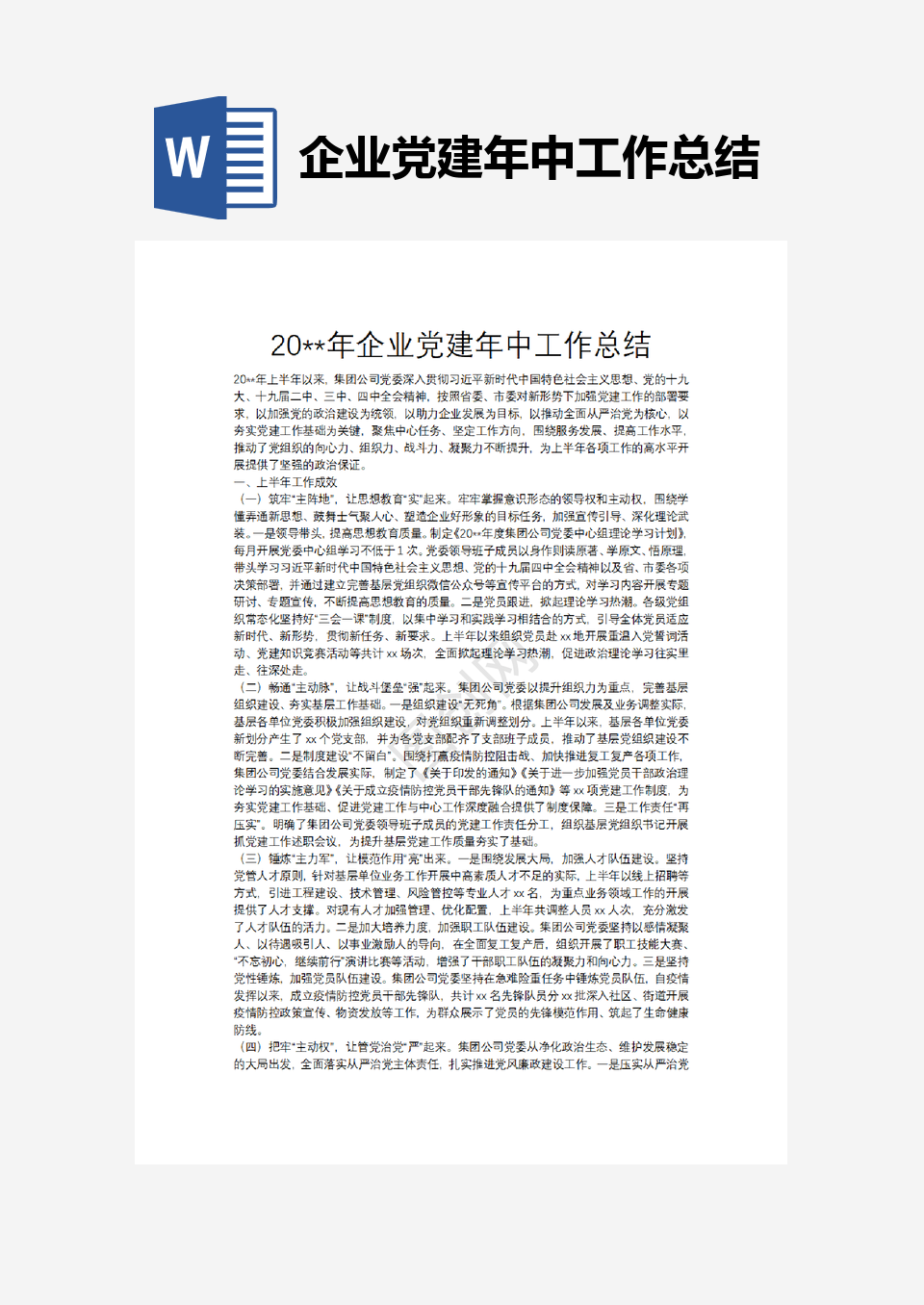 本作品内容为企业党建年中工作总结, 请使用软件Word(2019)打开, 作品中文字及图均可以修改和编辑,图片更改请在作品中右键图片并更换,文字修改请直接点击文字进行修改,也可以新增和删除作品中的内容, 欢迎使用闳图网。