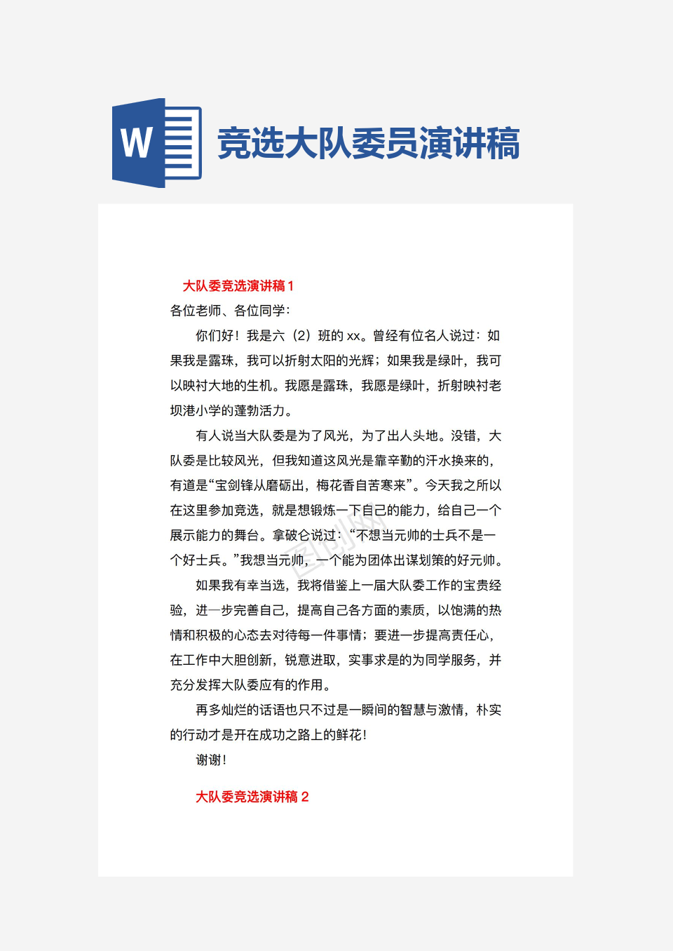 本作品内容为大队委竞选演讲稿(精选22篇), 请使用软件Word(2019)打开, 作品中文字及图均可以修改和编辑,图片更改请在作品中右键图片并更换,文字修改请直接点击文字进行修改,也可以新增和删除作品中的内容, 欢迎使用闳图网。