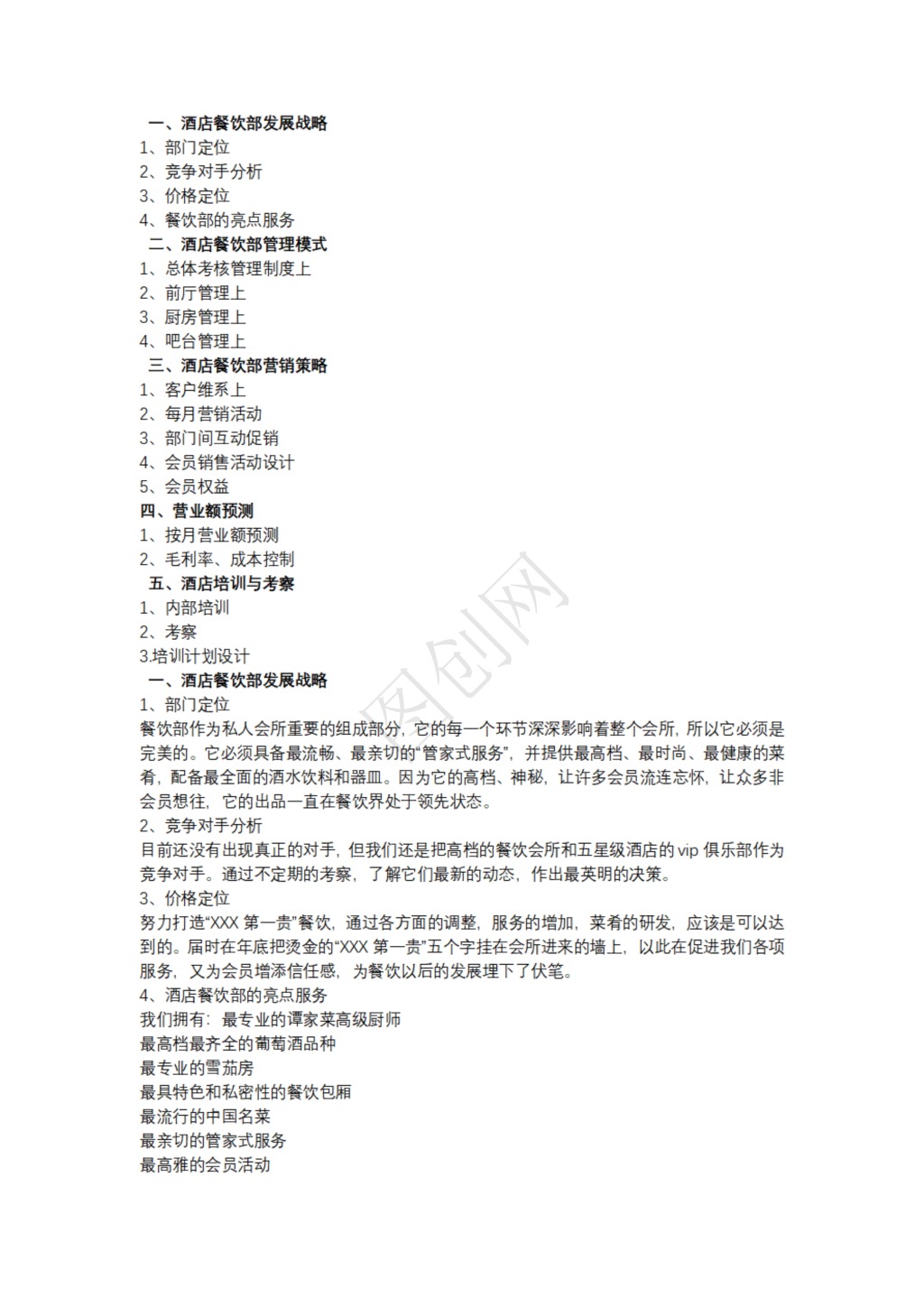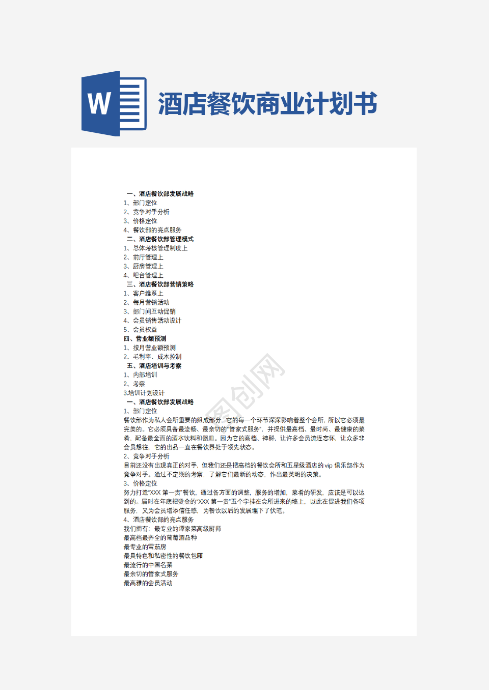 本作品内容为酒店餐饮商业计划书, 请使用软件Word(2019)打开, 作品中文字及图均可以修改和编辑,图片更改请在作品中右键图片并更换,文字修改请直接点击文字进行修改,也可以新增和删除作品中的内容, 欢迎使用闳图网。