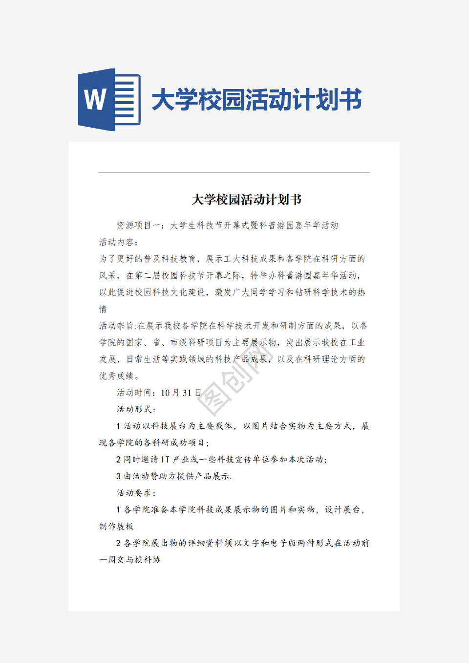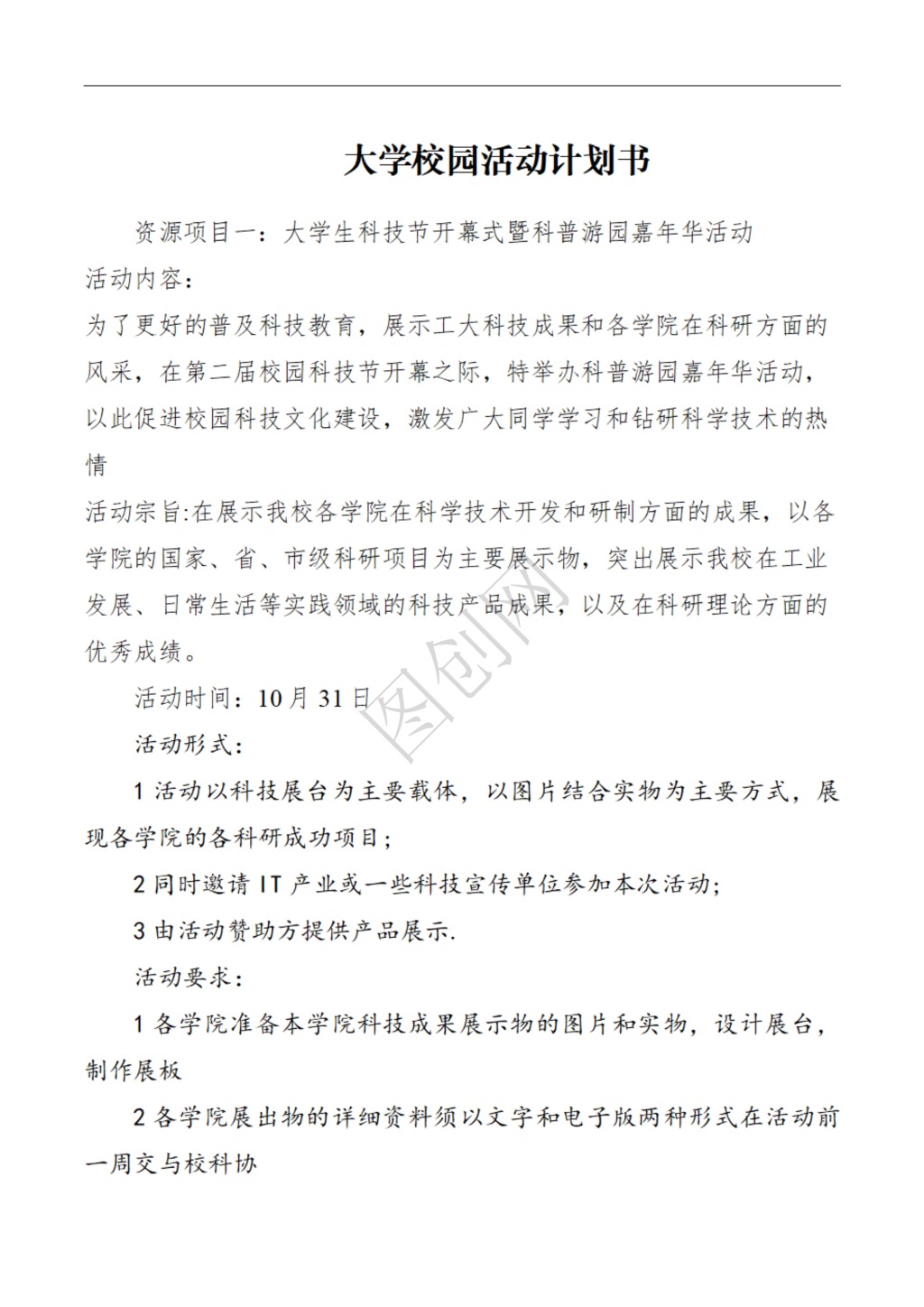 本作品内容为大学校园活动计划书, 请使用软件Word(2019)打开, 作品中文字及图均可以修改和编辑,图片更改请在作品中右键图片并更换,文字修改请直接点击文字进行修改,也可以新增和删除作品中的内容, 欢迎使用闳图网。