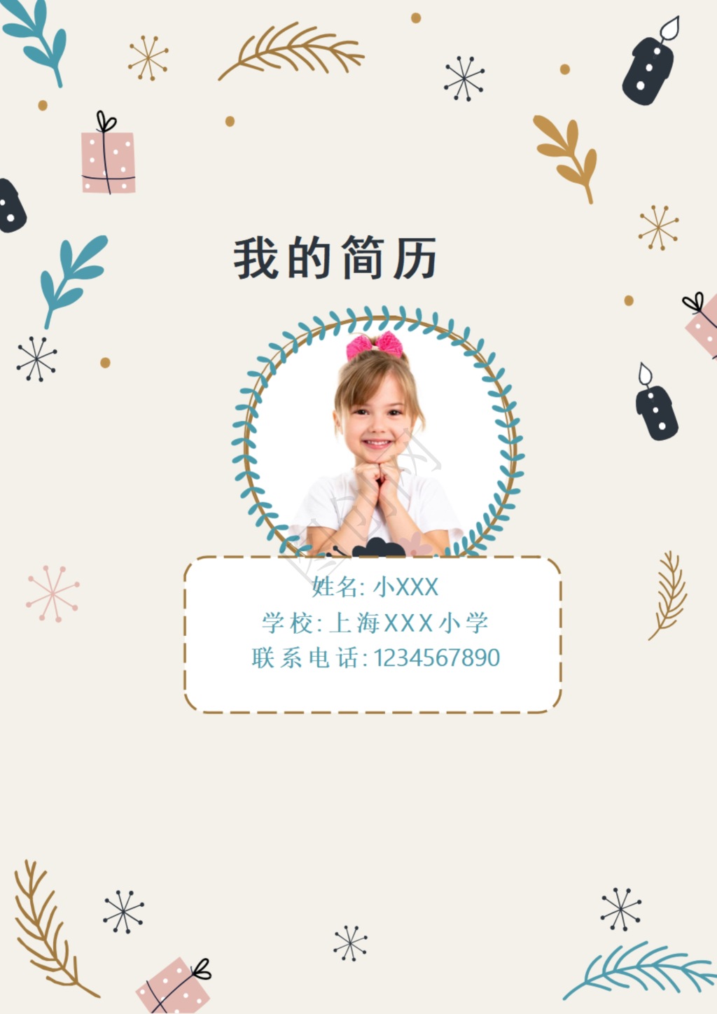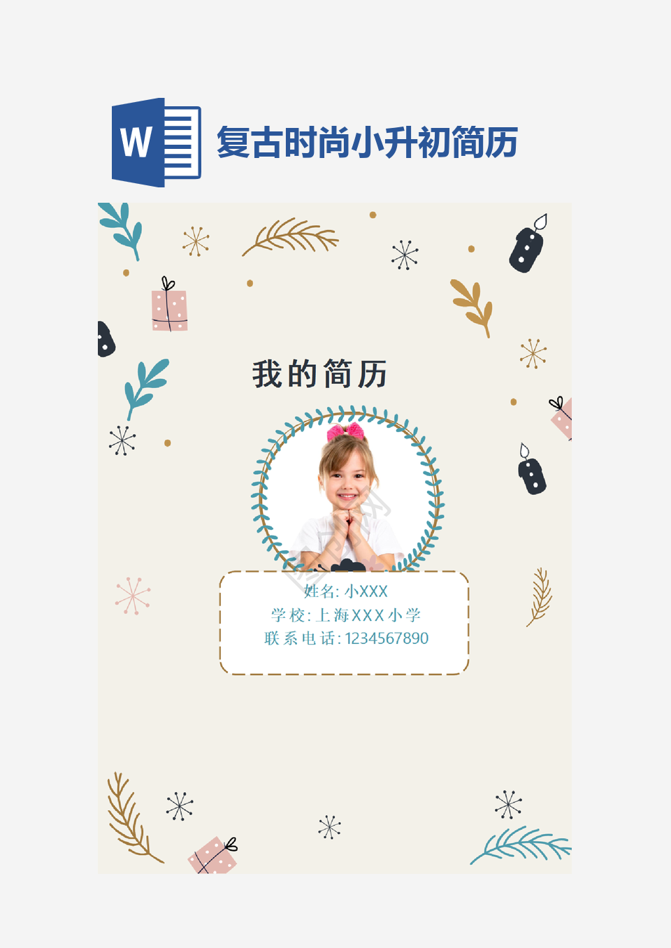 本作品内容为复古时尚小升初简历, 请使用软件Word(2019)打开, 作品中文字及图均可以修改和编辑,图片更改请在作品中右键图片并更换,文字修改请直接点击文字进行修改,也可以新增和删除作品中的内容, 欢迎使用闳图网。